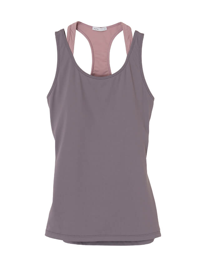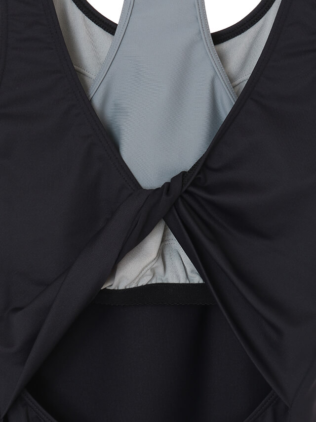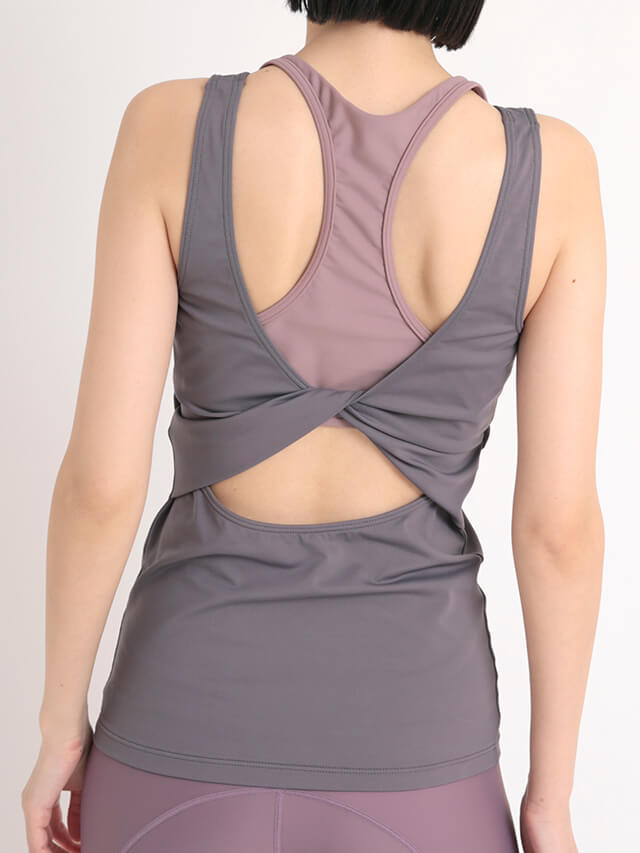 フロントはシンプル、バックがリボンになったアクティブタンクトップ。ねじったデザインが特徴的で、程よい肌見せで女性らしさを演出。肩甲骨フリーで動きやすく、ニュアンスカラーの配色もアクセントになるアイテム。
