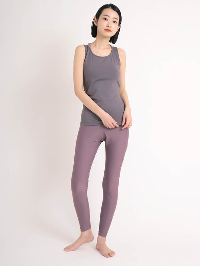 マットな光沢感がある素材で、弾力がありしっかりした厚みがあります。ストレッチ性や速乾性にも優れており、常温ヨガはもちろん、ホットヨガにも使用できます。