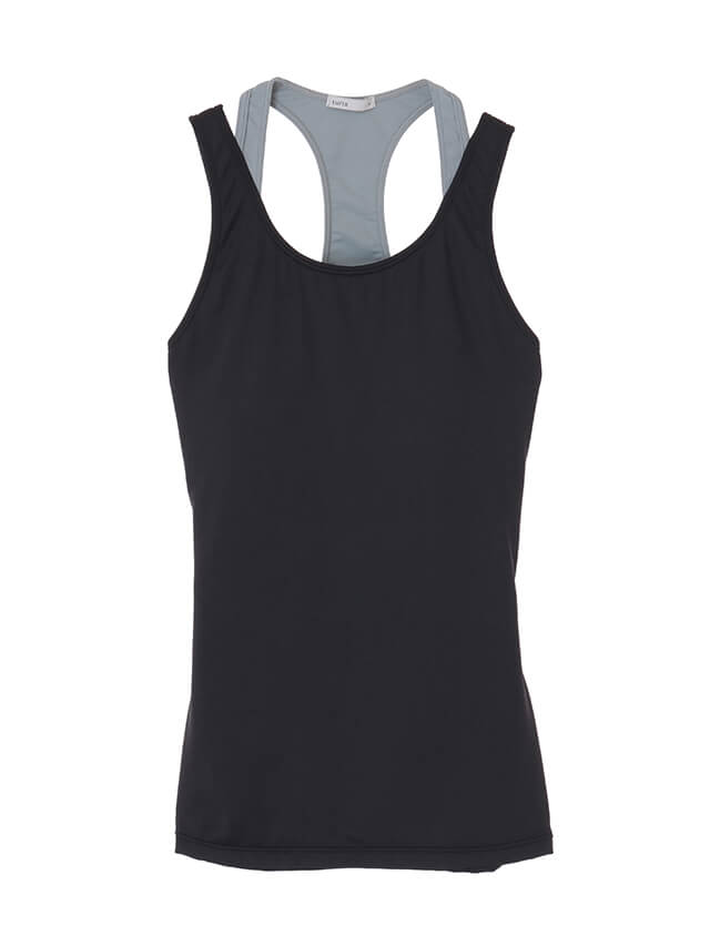 バックのリボンのようなねじったデザインが特徴のタンクトップ。2トーンの配色が可愛らしい。