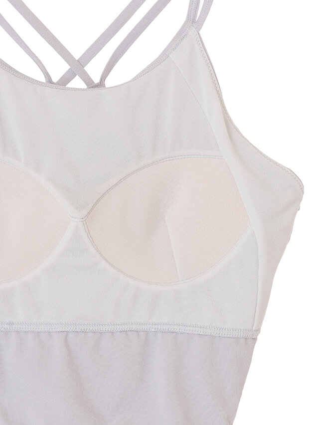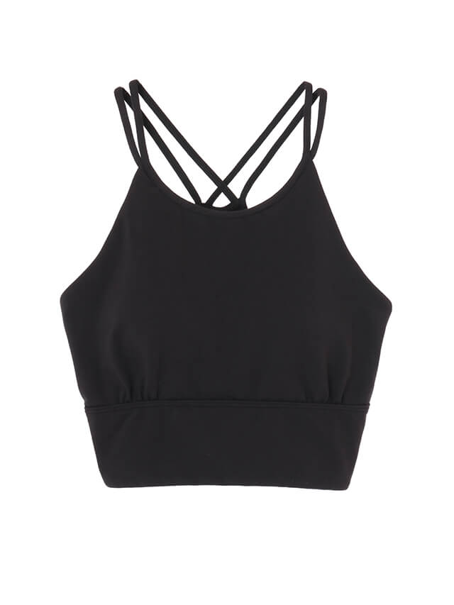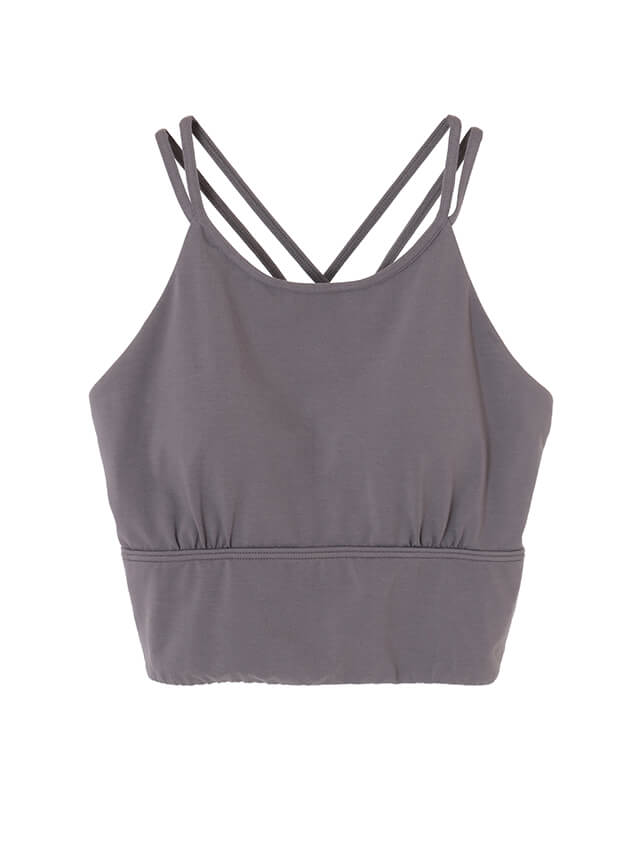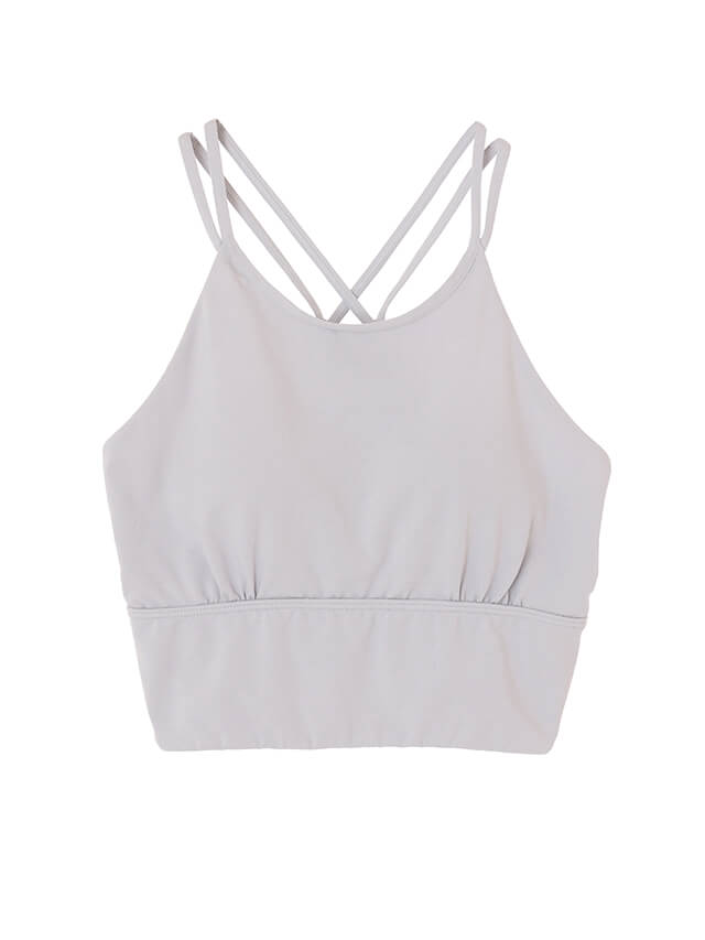すっきりとしたアメリカンスリーブのブラトップは、後ろの華奢なクロスストラップがポイント。コットンタッチでさらりとした素材の風合いが魅力的なアイテム。