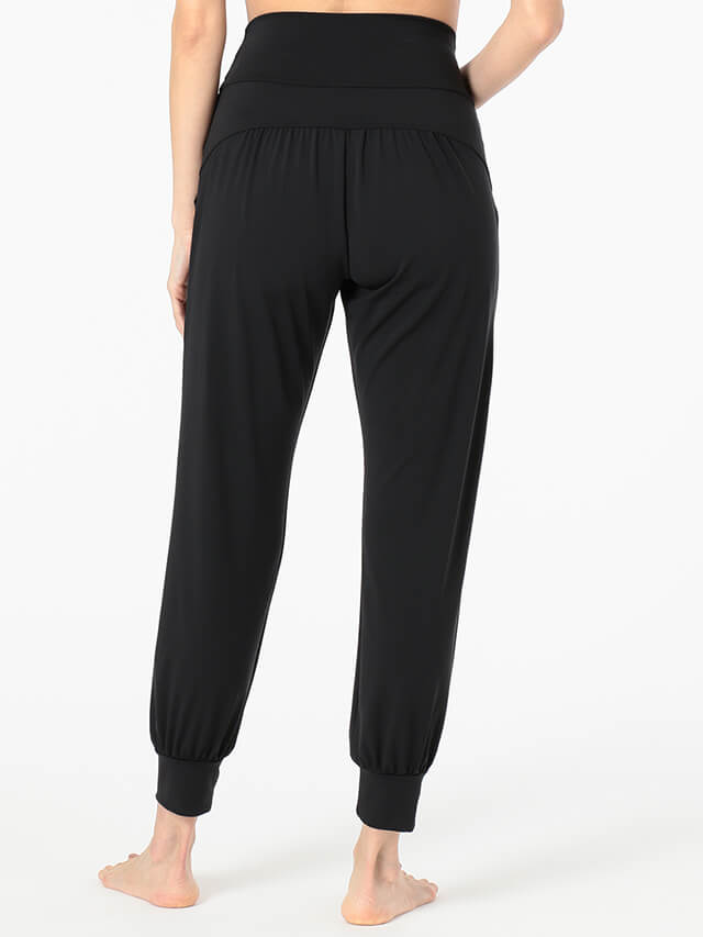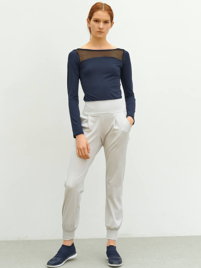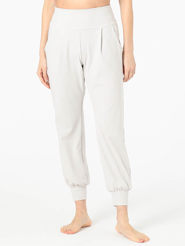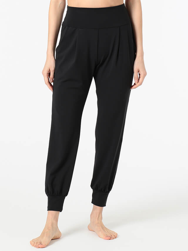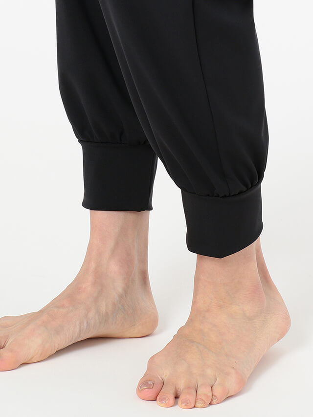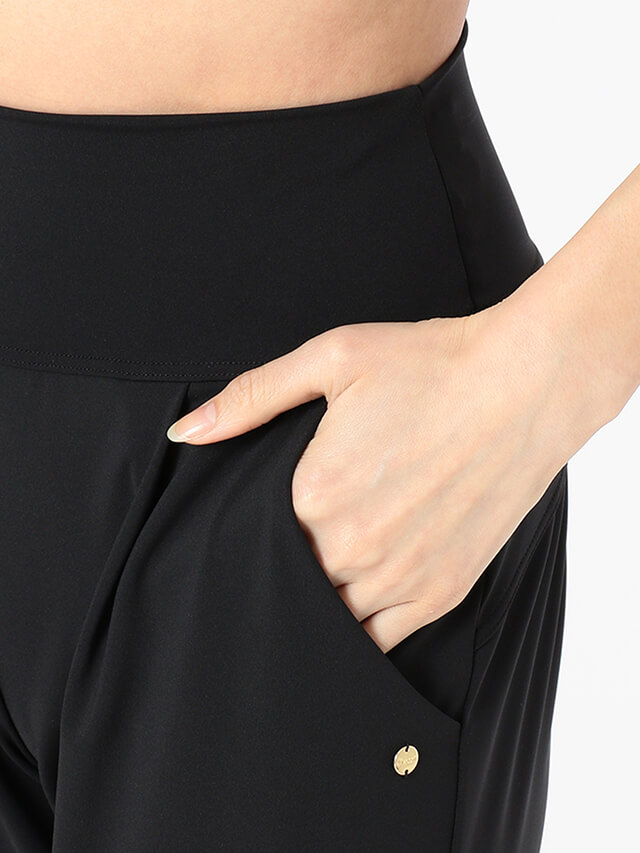 足首上でピッタリとフィットしてとにかく動きやすいのが魅力。足を上げるポーズもめくれが気になりません。バックには細かいギャザーが施してあり、ヒップを高く、スタイル良く見せてくれます。ウエスト周りは太めの切替えでスッキリと。ハイウエストで折り返して履くこともできます。両サイドポケット仕様で普段使いにも活躍します。