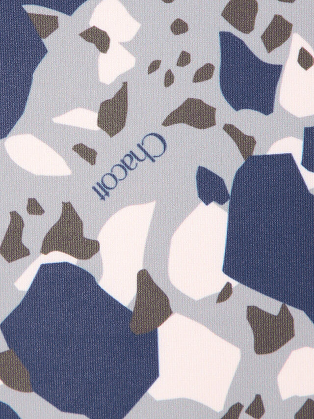自然をテーマにというシーズンコンセプトから、どっしりと安定感のある大地、大地が生み出す石、そこから生まれる天然の模様を「静の柄」としてシンプルなグラフィックデザインで表現されています。お腹周りはほどよくゆるみがあり体のラインを拾いにくいデザイン。