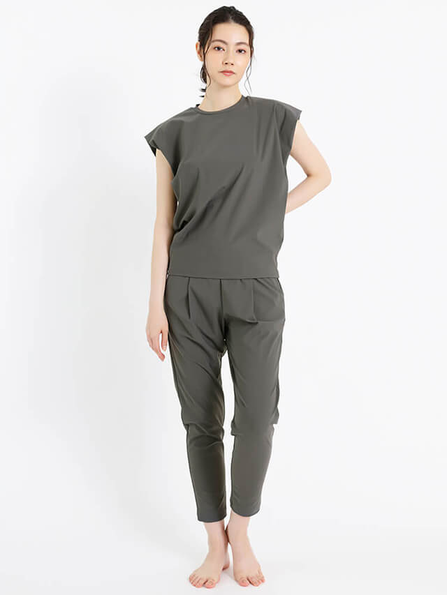 美しいレッグラインをつくり出す、シルエットにこだわられたテーパードパンツ。紫外線カット効果があり、ちょっとしたお出かけにも活躍。