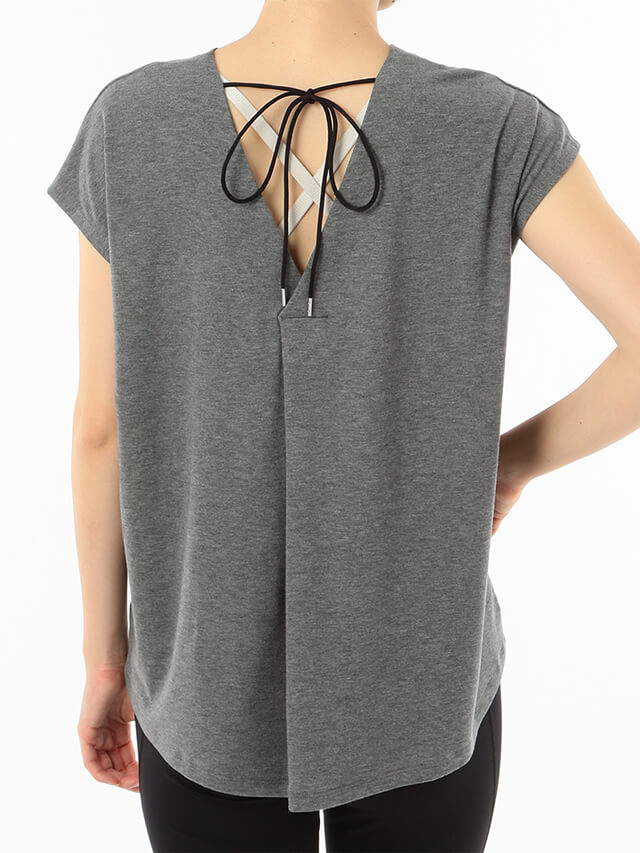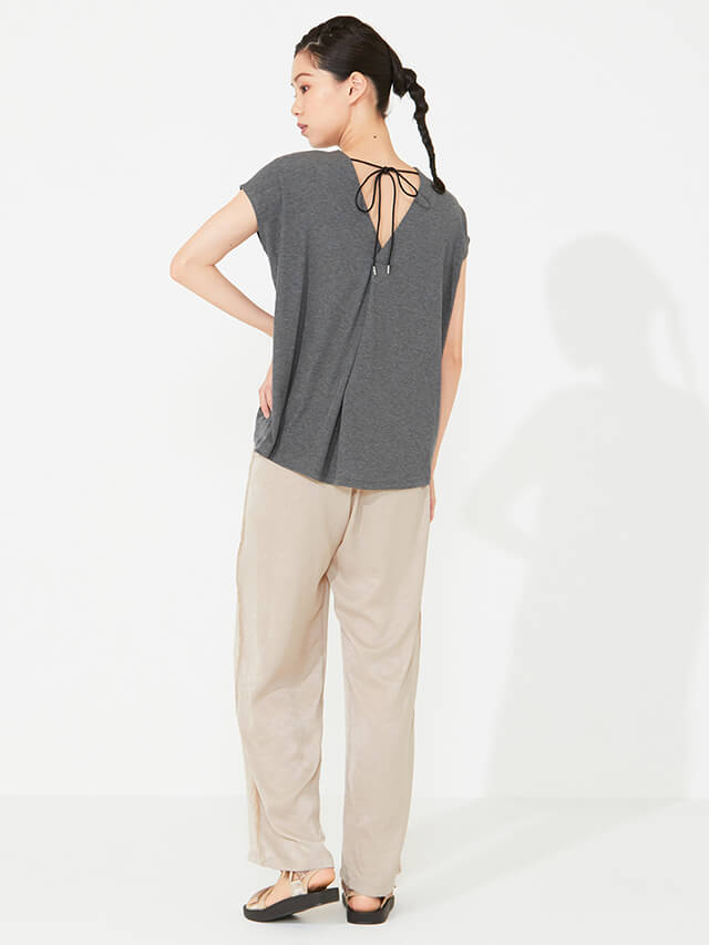 バックのリボンと肩にかかるフレンチスリーブがフェミニンなデザインTシャツ。