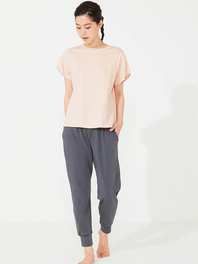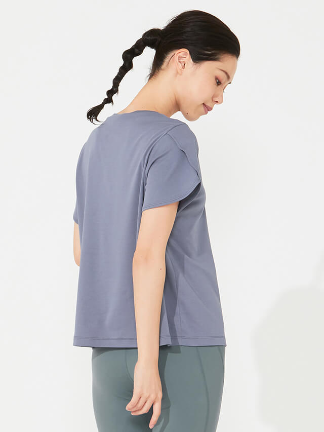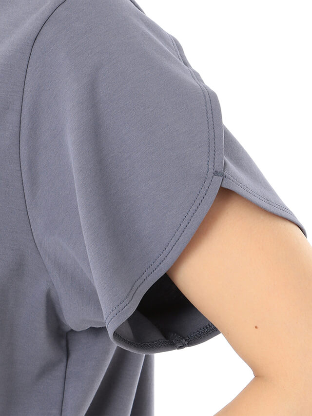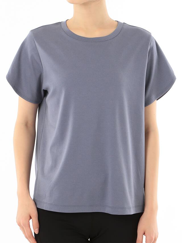 上質なインド綿のみを使用し原料が持つ風合いを活かす紡績方法でやわらかくしっとりと肌になじむ風合いが特徴の糸を使用しています。ハイゲージに編み上げることで繊細な表情とやわらかな風合いを持ちながらも型崩れしにくいしっかりとした肉感のスムース素材。