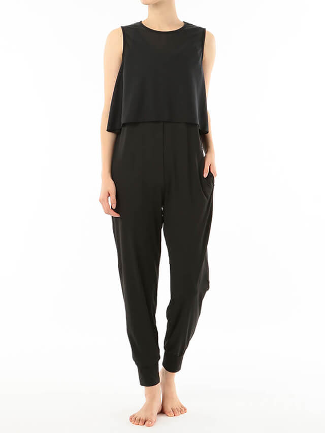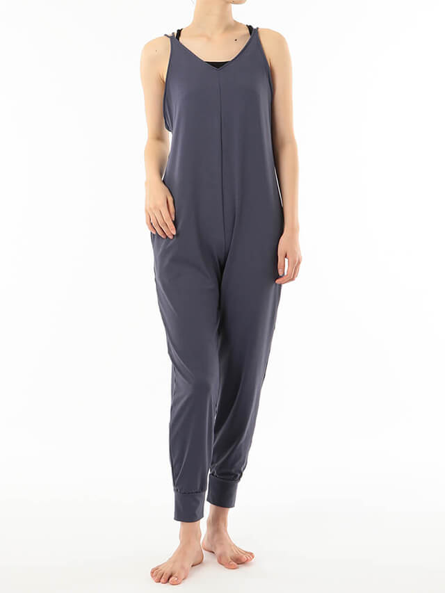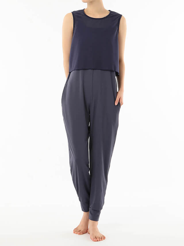 オールインワンはリラックスシルエットでボディを開放しながらも裾周りはコンパクトにフィットするためレッスンシーンで重宝する一枚。肩ストラップは、後ろで結んでサイズ調整も可能。両サイドにポケット付きです。