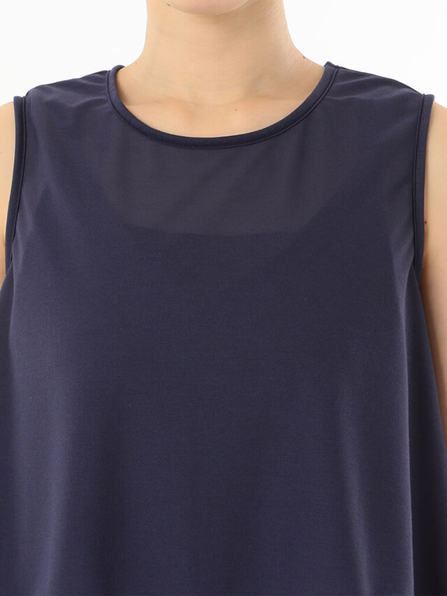 オールインワンにはしなやかな手ざわりとマットな見た目を兼ね備えた人気素材「NILO」を使用。UV効果もあり、快適な着心地です。セットのレイヤードトップスは独特の表情感のあるシフォン素材。薄く軽く、空気をはらんだよなやわらかいエアリードレープ感が魅力。