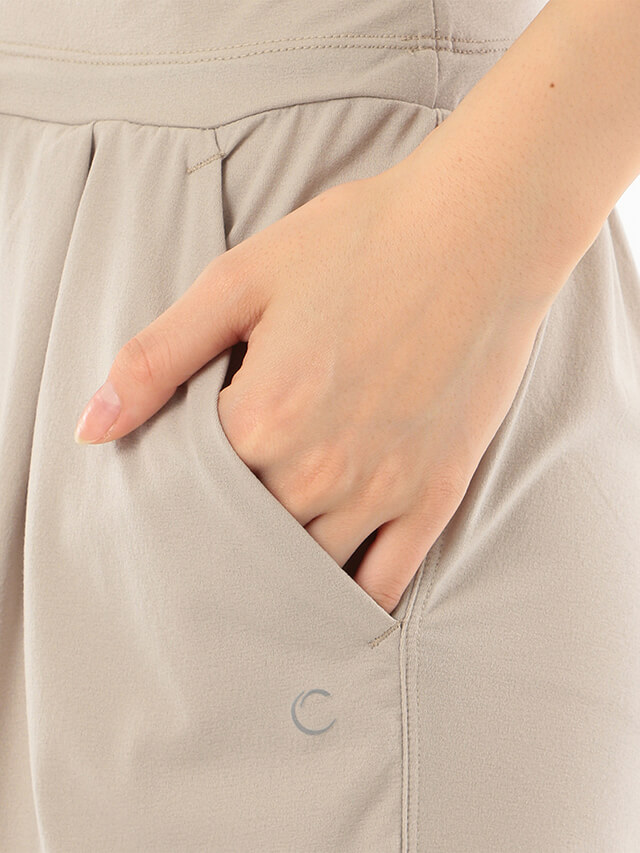 ポリウレタン(ゴム)を使わず、ストレッチ性のある特殊な糸からできたナチュラルストレッチ素材を使用。それによりコンパクトで超軽量を実現しています。ゆったりとした腰回りからスッキリとタイトな足口に繋がる綺麗なシルエットが自慢。UVカット効果もありデイリーでも活躍すること間違いなし。