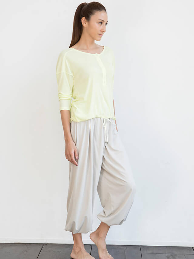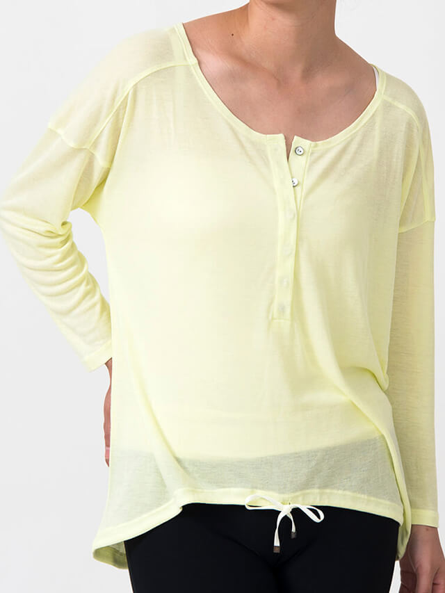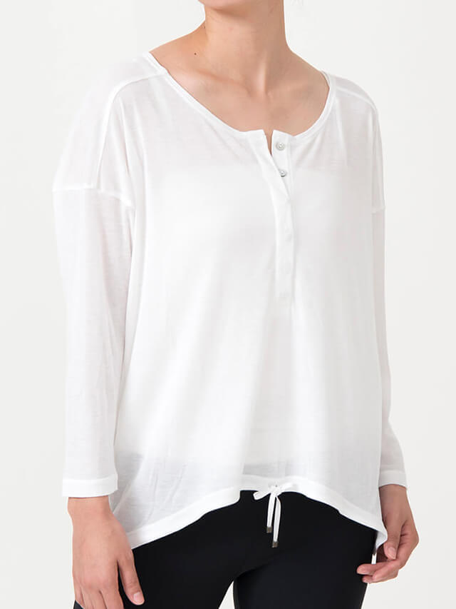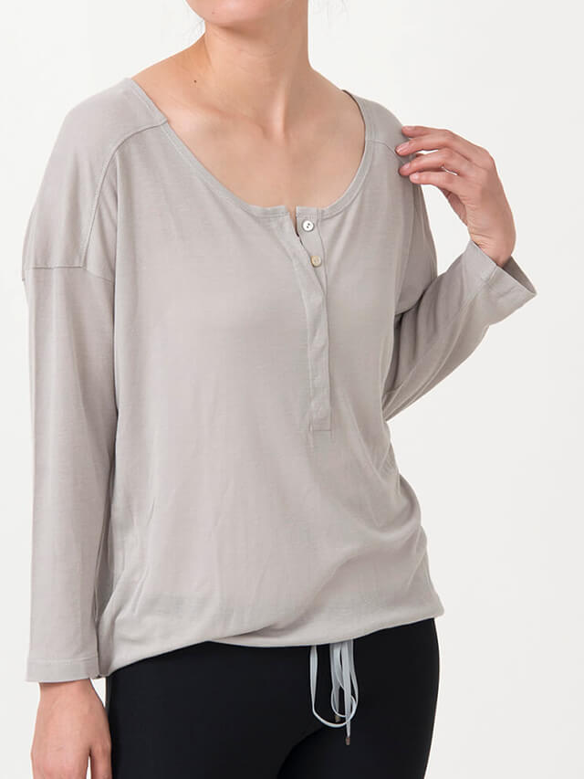ゆったりルーズに着こなせてるラグランスリーブの長袖トップス。天然の貝素材を使用したボタンがポイントのヘンリーネックデザインが特徴です。