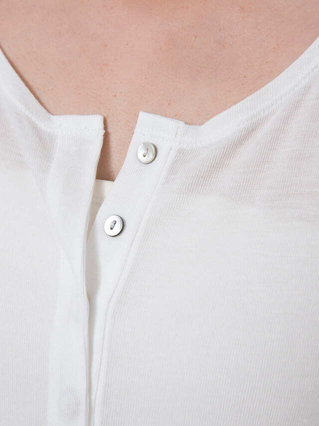 - 天然貝で作られた貝ボタンを使用した、こだわりのヘンリーネック。