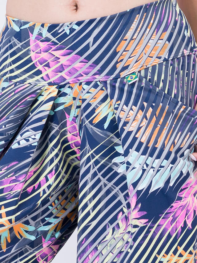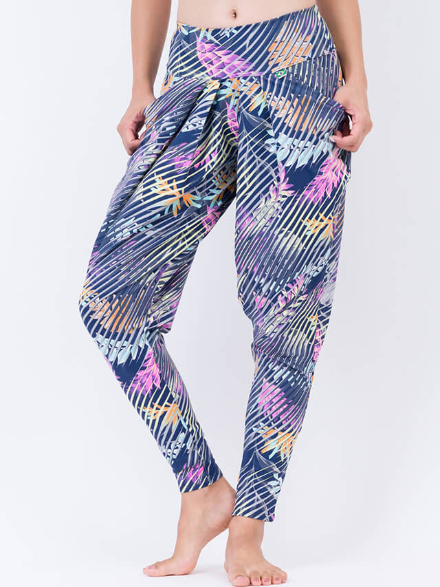 ネイビーベースにまずフラワーやリーフモチーフを配置し、さらにその上に大きなヤシの木の葉っぱをランダムに描いた個性的なプリントです。ネオンカラーの花々が明るい印象を与えてくれます。