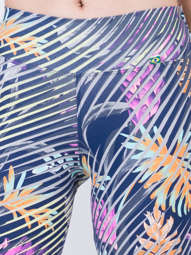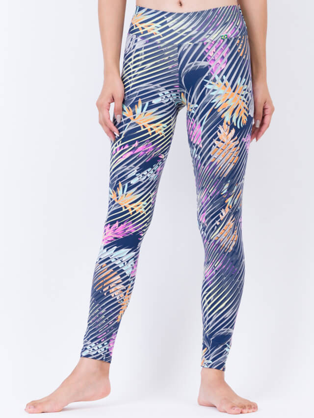 ネイビーベースにまずフラワーやリーフモチーフを配置し、さらにその上に大きなヤシの木の葉っぱをランダムに描いた個性的なプリントです。ネオンカラーの花々が明るい印象を与えてくれます。