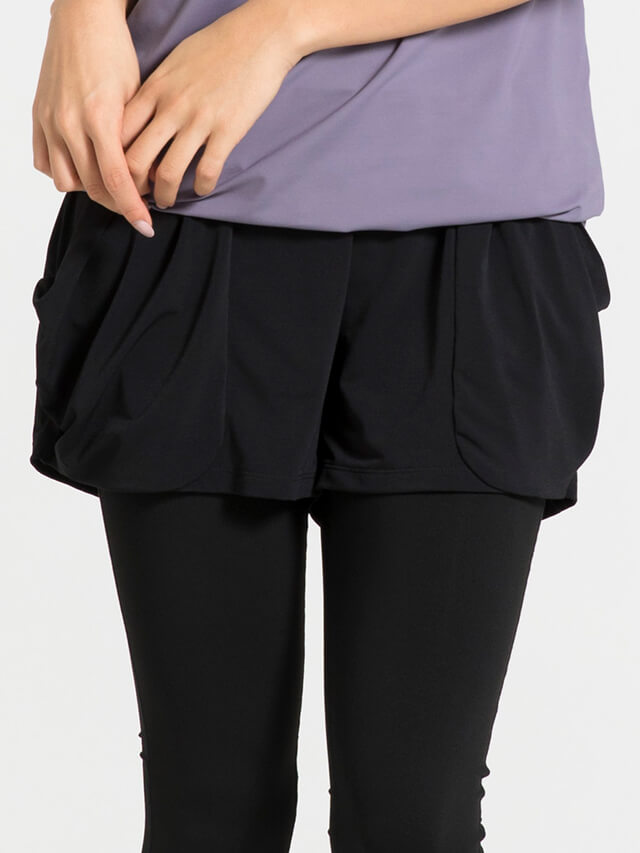 レギンスでは丸見えになるボディラインをショートパンツで上手にカバー。オシャレ度も女度もアップ!