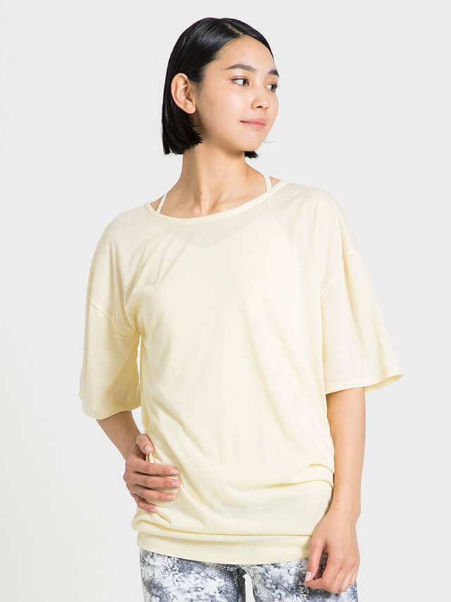 袖も身頃もビッグシルエットのゆったりTシャツ。しっかりとした厚さと柔らかさのある素材を使用。スリアが得意なニュアンスカラー2色に加え、トレンドのイエローもカラーバリエーションに。透け感のある軽やかな色で、コーデに取り入れやすく。