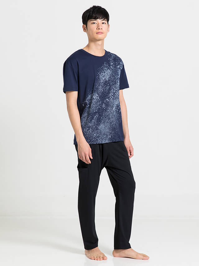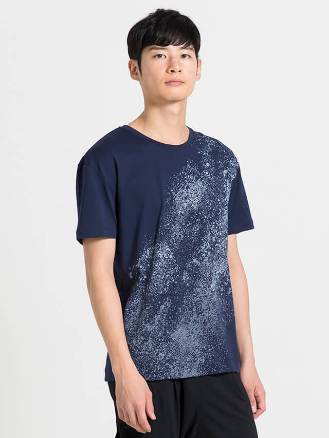 全面にペンキを垂らしたような個性的なプリントTシャツ。ナュラルな風合いながら比較的速乾性のあるポリエステルコットンを使用。また着用するとひんやりと感じる接触冷感機能も持ち合わせています。シルエットも身体を動かしやすいよう少しゆとりを持たせています。