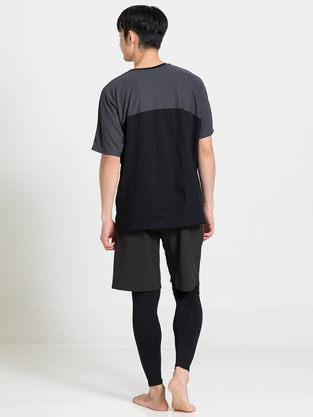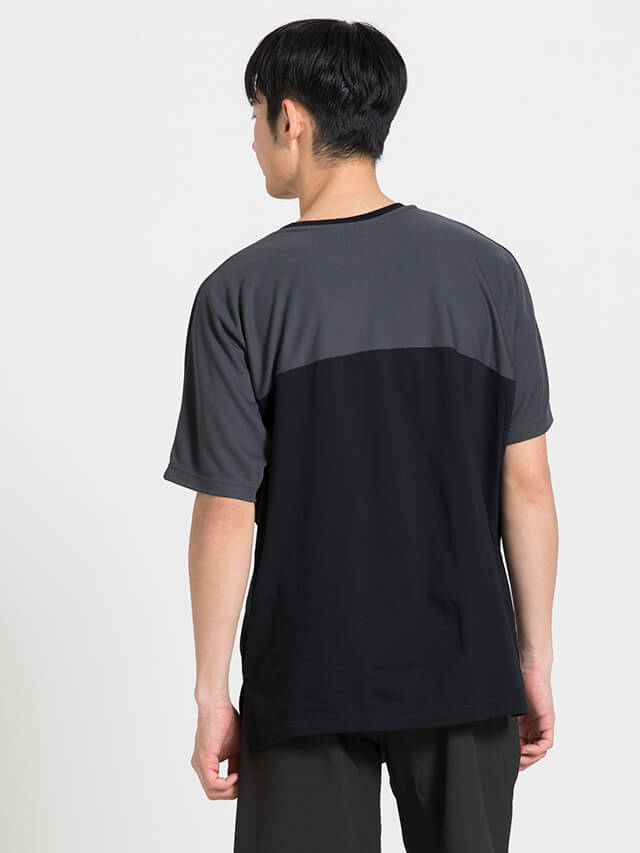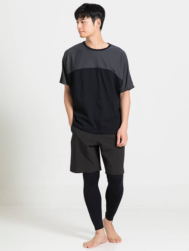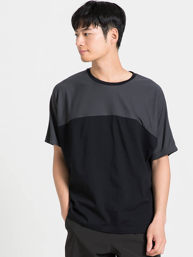 一見シックでシンプルなバイカラーTシャツですが、身頃上部の素材には消臭・抗菌防臭・吸水速乾・UVと高機能素材を使用。レッスン中も汗などを気にせずアーサナに集中できそう。衿と身頃下部はコットン100%の肌触りの良い素材を使用しています。今年らしいゆったりとしたリラックス感のあるシルエット。シンプルなコーディネートにもさりげなく遊びを入れられるアイテムです。