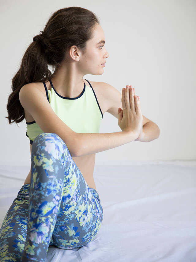 トレンドのハイネックラインを採用したブラトップ。ヨガシーンではお洒落なだけでなく、前かがみになっても胸元が安心というメリットも◎。