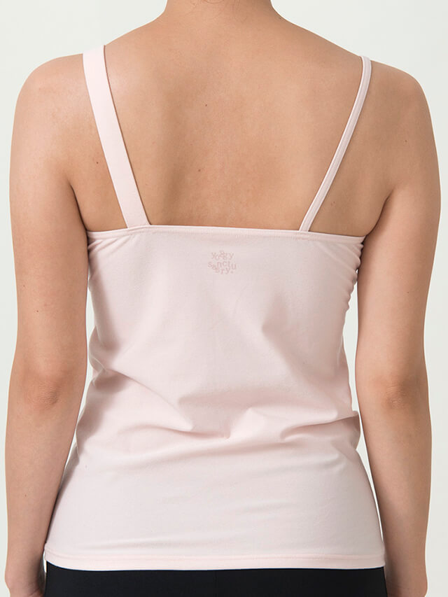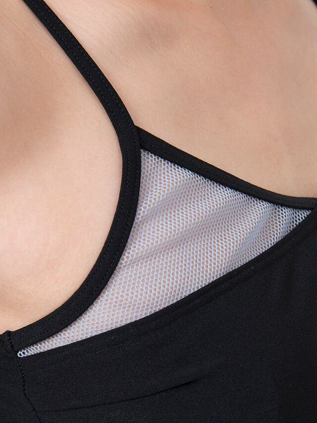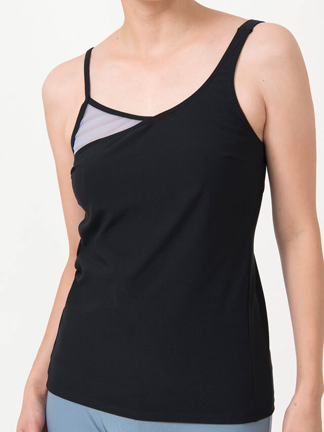 ワンショルダー風のデザインと右側の胸元に入った切替メッシュがポイントのキャミソール。女性らしいデザインにスポーティーなアクセントを加えたヨギー・サンクチュアリらしいアイテムです。