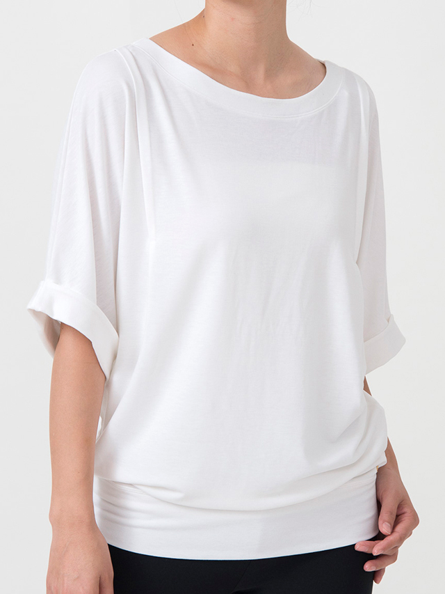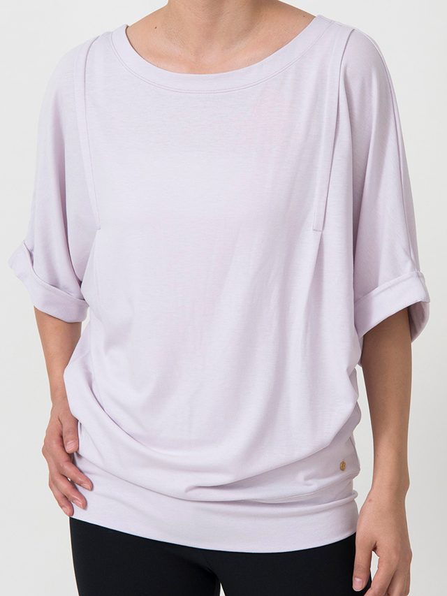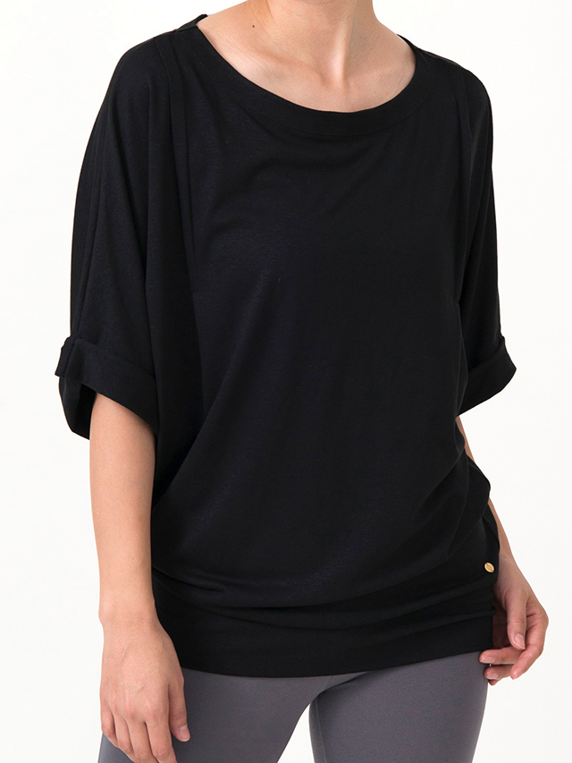 袖口はロールアップされ、フロントの肩の部分にはタックが入っていることで立体感が生まれています。丈は長めなので、お尻を隠したい時は伸ばして、ヨガ中は腰のあたりでフィットさせて。