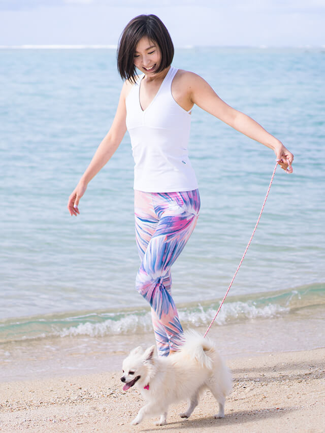 透明感溢れる淡い色合いのプリントがおしゃれ。ホワイトのタンクトップと合わせて、爽やかに着こなして。