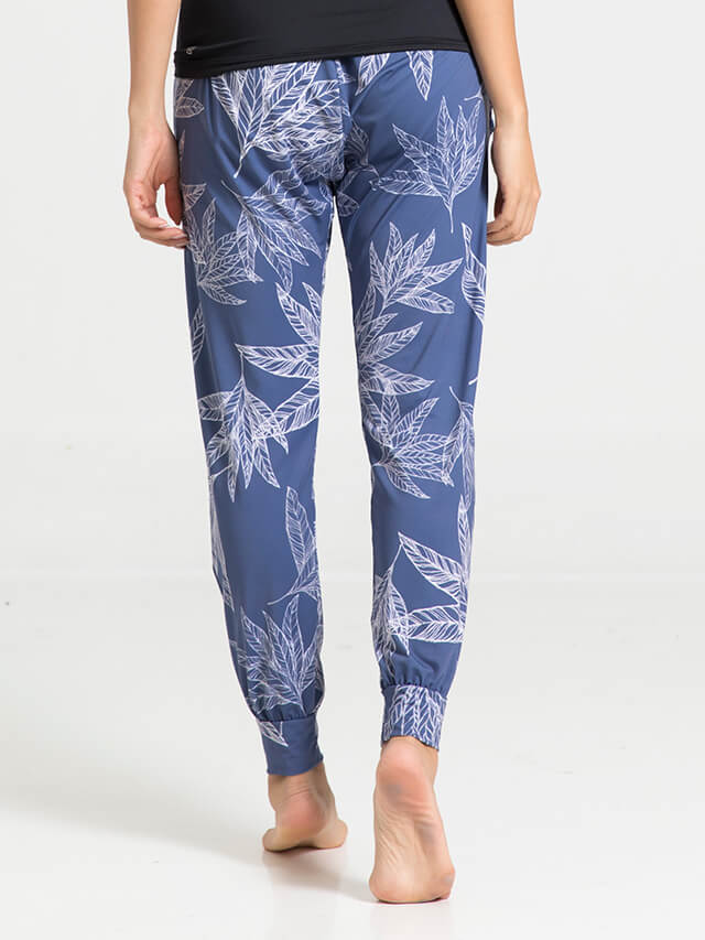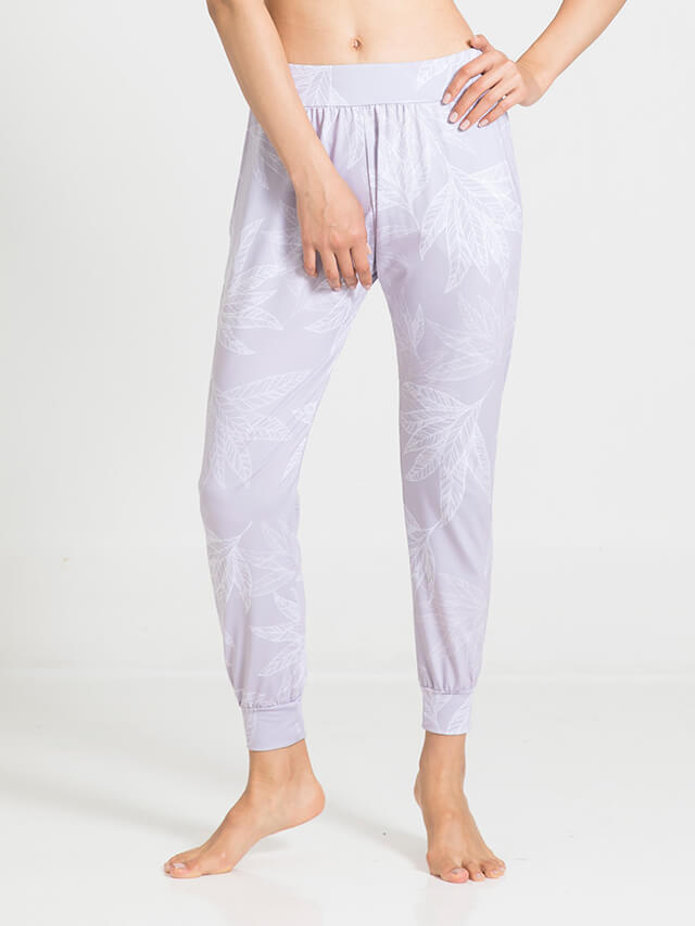 大きめのリーフモチーフが繊細に描かれたゆったりシルエットのパンツ。太もも周りはゆったり、裾は太めの切り替えで足首周りがもたつかず、全体としてスッキリとしたシルエットに仕上がっています。レギンスのように脚のラインをはっきり出したくないという方にもオススメです。