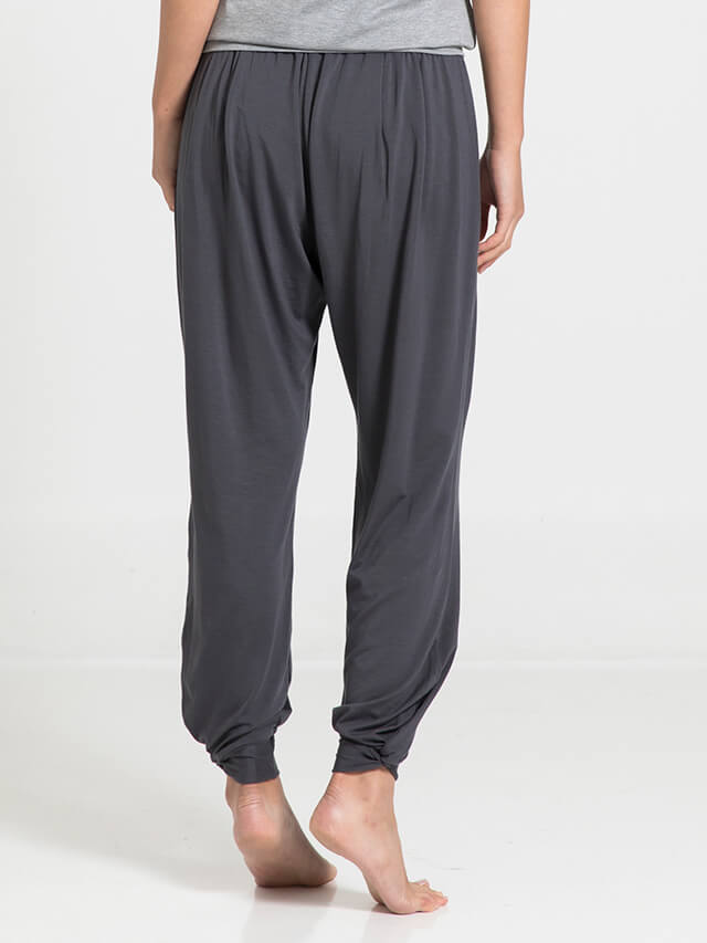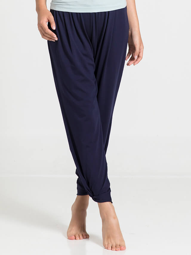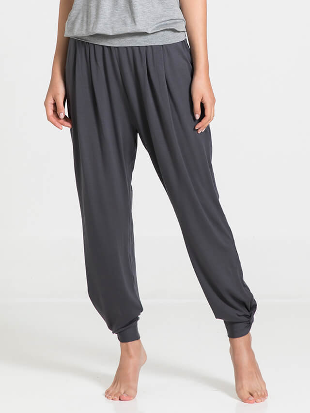 裾のクロスデザインがポイントのロングパンツ。脚を上げたり逆転のポーズなどでは、裾のフィット感が重要ですが、このパンツならめくれ上がりの心配がなく、また締め付け感がないのでストレスフリーなはき心地です。