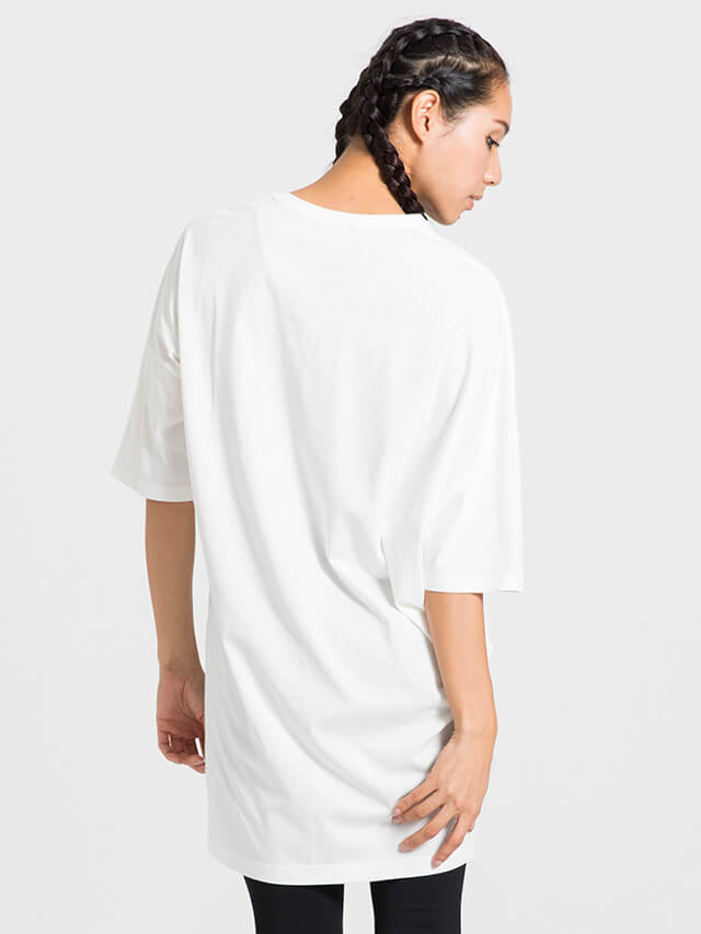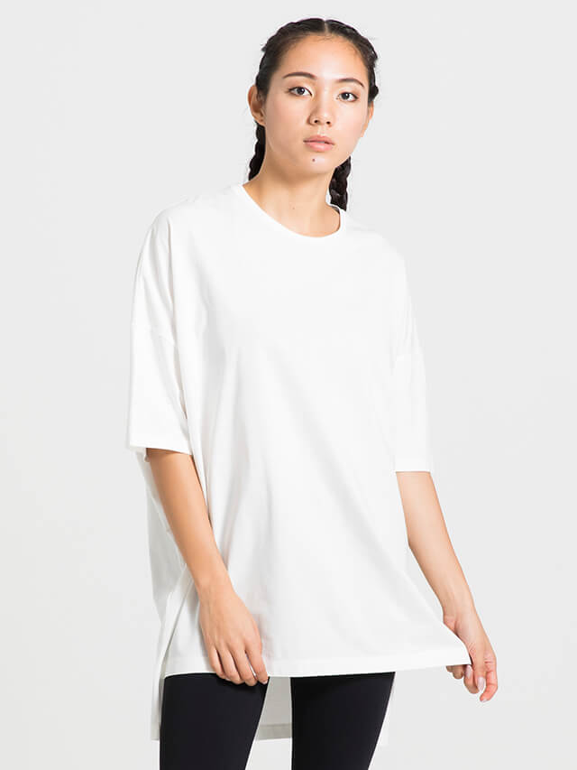 後ろ身頃が長めのデザインは脚長効果も◎。大きめシルエットのトップスはレギンスと好相性。気になるヒップ周りをカバーしてくれます。
