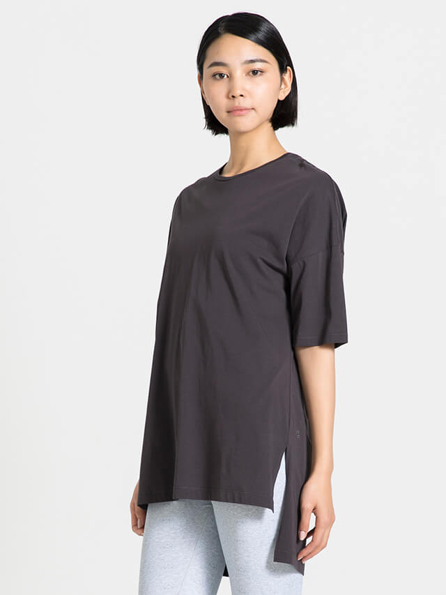 ゆったりシルエットのアシンメトリーチュニック。左袖はすっきりライン、右袖はゆったりドルマン調のデザインになっています。