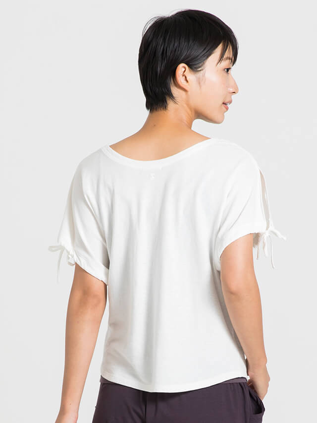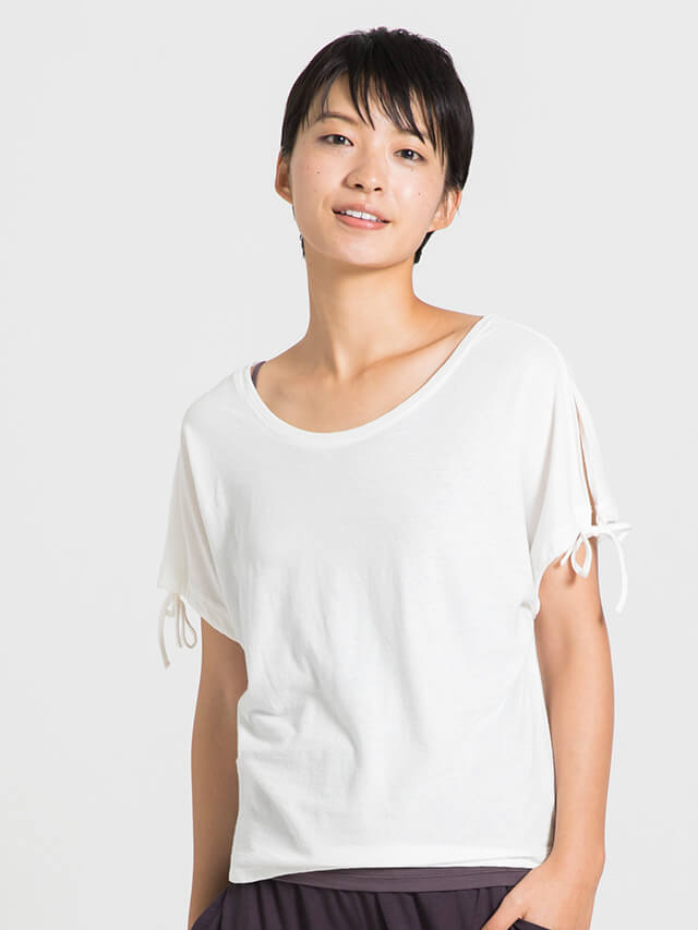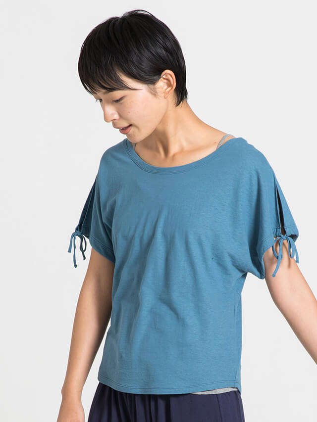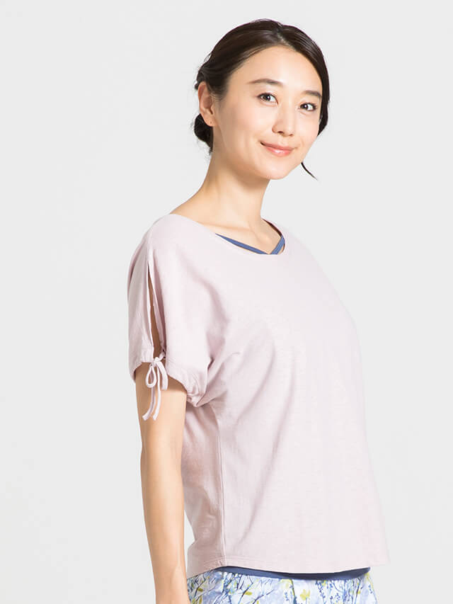 女性らしい丸みのあるライン、袖に入ったスリットとドローコードが女性らしい半袖トップス。袖口を絞ってふんわりと、パフスリーブのようにアレンジして着ることも可能です。程よく開いた襟元も、デコルテラインを綺麗に見せてくれます。