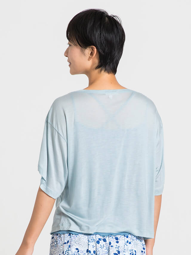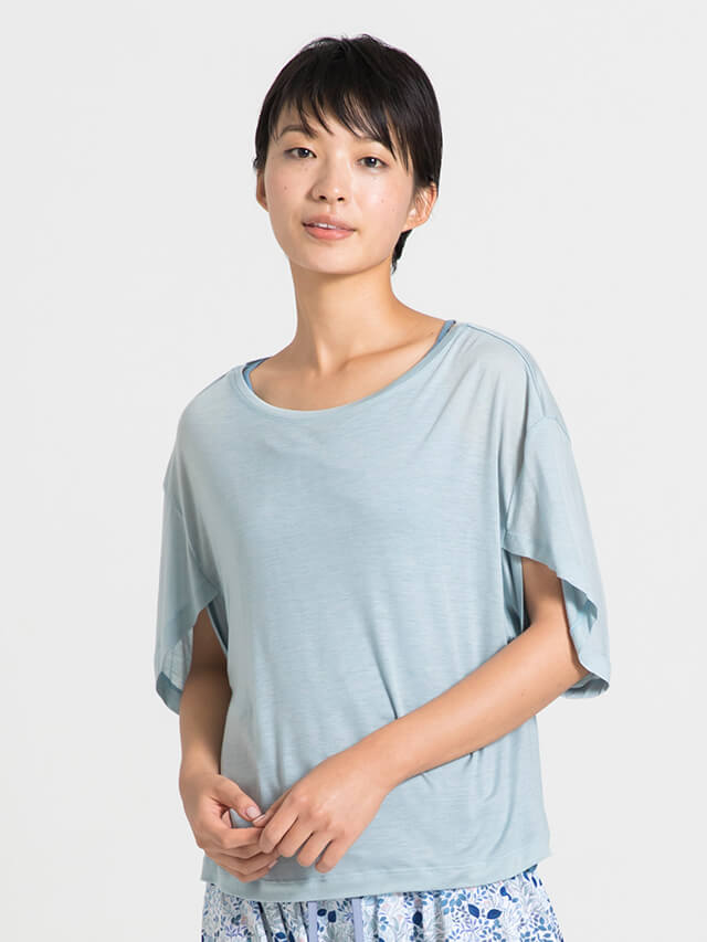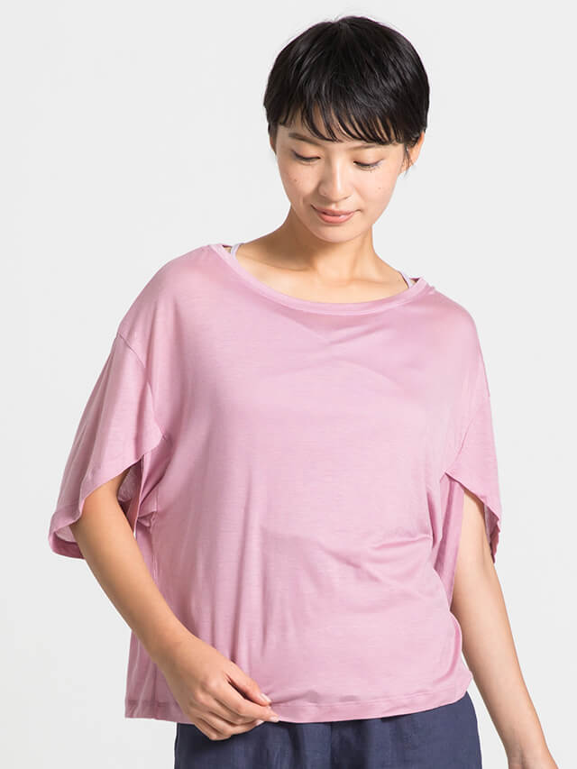 花弁を重ねたように袖先が広がったエレガントなチューリップスリーブが魅力の半袖トップス。肩線を落とし、リラックス感を出しながらも腕は動かしやすいデザインです。