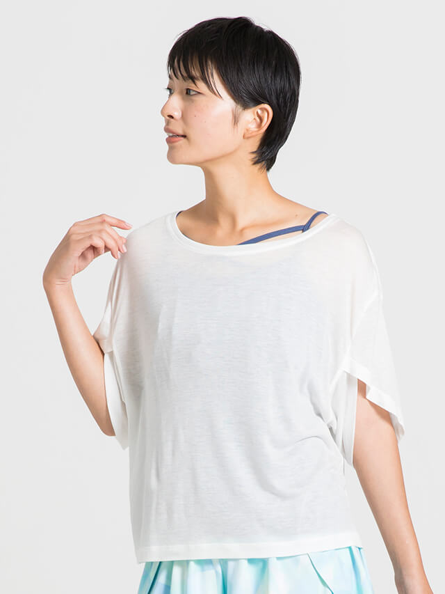 暑い時期でも、透け感のある涼しげな素材はタンクトップやキャミソールの重ね着として使いやすく便利。気になる二の腕をカバーしつつ、野暮ったくならず女性らしい着こなしが叶う一枚です。
