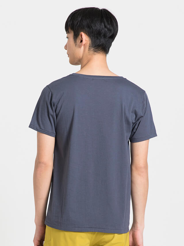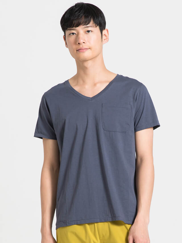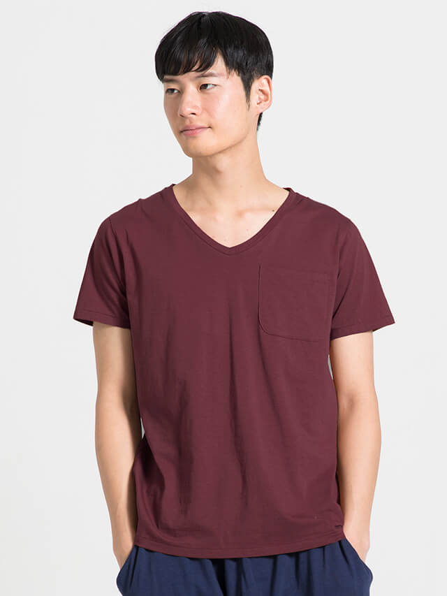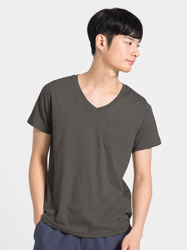 左胸ポケットがポイントのシンプルなVネックTシャツ。シックな色使いと上品な艶感で、カジュアルすぎない大人っぽい着こなしに。