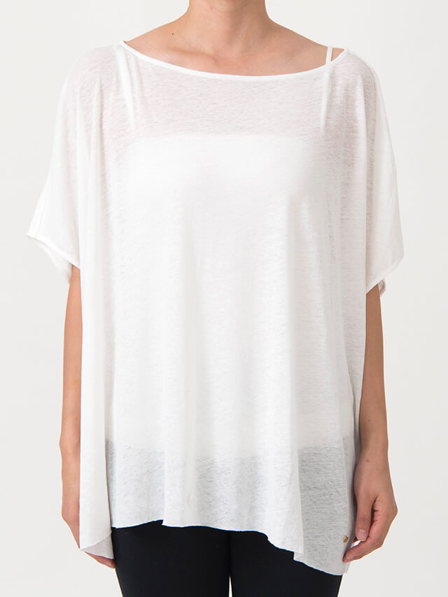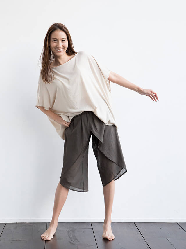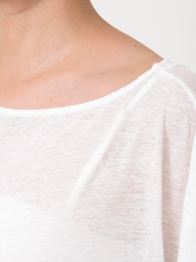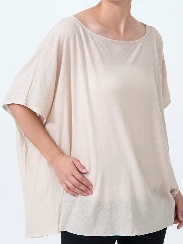 綿に麻を混紡したさらりとした着心地が気持ちの良いトップス。透け感があるので、インナーにあえて柄物を合わせておしゃれなレイヤードスタイルを楽しむことも可能。