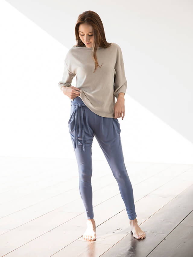 ヒップ周りはゆったり、ひざ下からは細身のシルエットのヨガパンツ。ヒップや太ももなど気になるところをカバーしつつ、スッキリ見える万能パンツです。