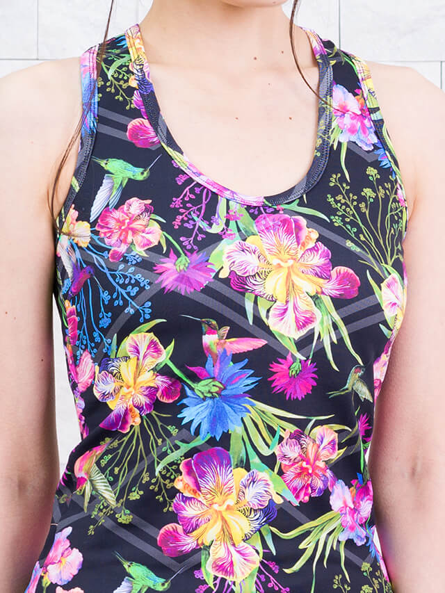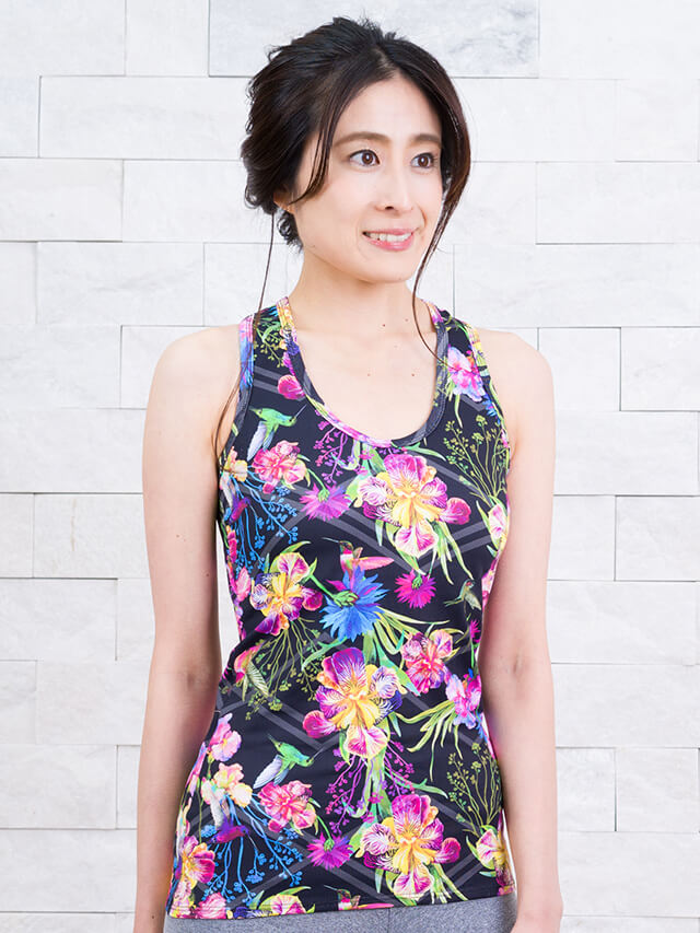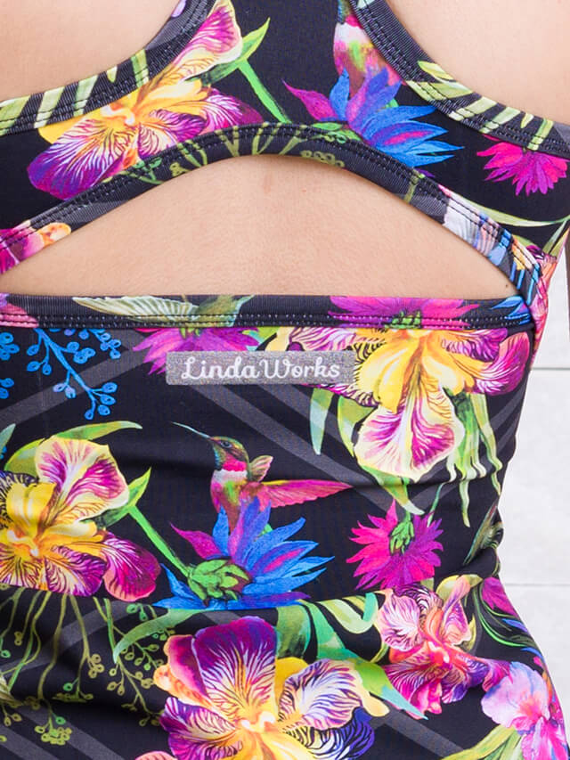 リンダワークスで毎回大人気のブラックベース×フラワープリント。鮮やかな花々の間にハチドリが飛んでいるのがキュート。ブラックベースなので、色とりどりの花柄プリントもフェミニンになりすぎず引き締まった印象に。うっすら入った直線のプリントがモダンなテイストをプラスしています。