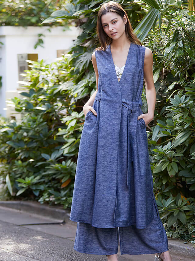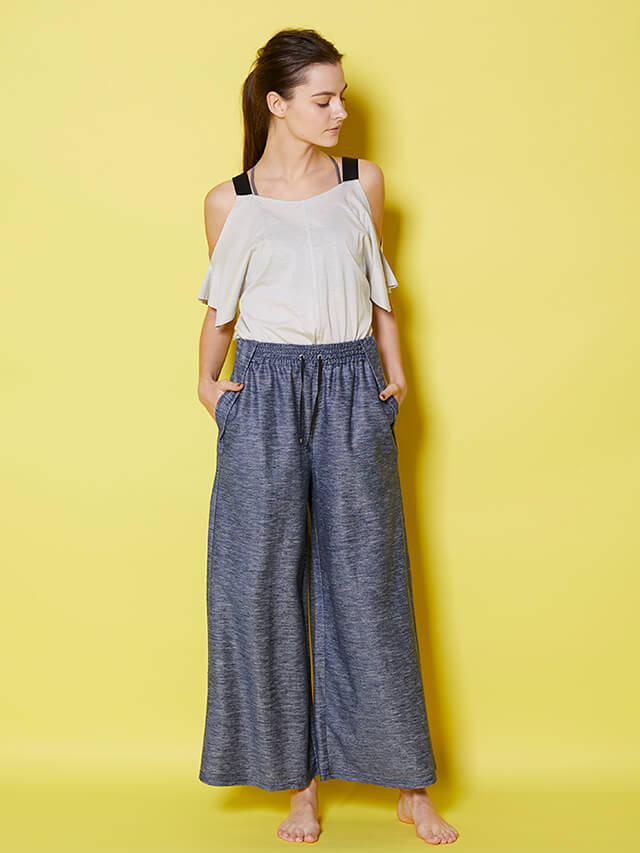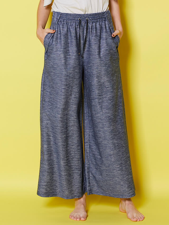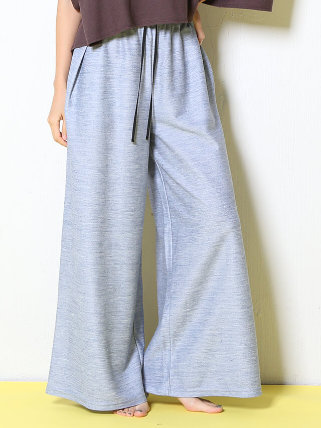 ウエストのディティールに拘ったイージーパンツヨガの行き帰りにさっと脱ぎ着できる便利アイテムです。リネンの素材感で日差しの強い夏にも、汗を書いた後の肌にも涼しくさらりと着ていただけます。上質で光沢感のあるデニム風素材はどんなカラーのトップスとも合わせやすく、着回し力の高さも魅力です。
