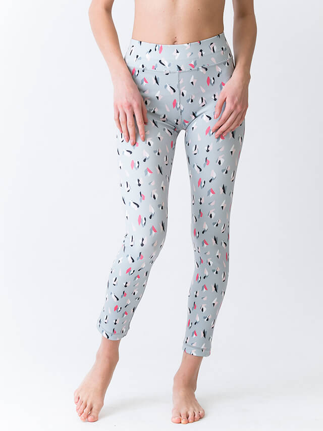 可憐な小花をイメージしたオリジナルの幾何学模様。色使いも可愛らしく、フェミニンに着こなせます。優れた伸縮特性をもち、ヨガやワークアウトのあらゆる動きに対応するレギンス。中肉素材ですが軽く、シワになりにくい素材です。