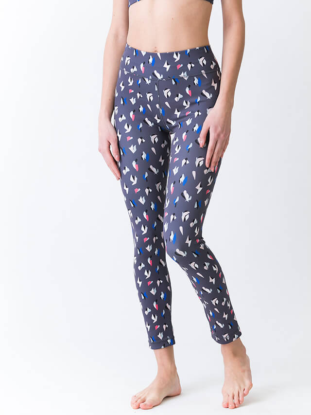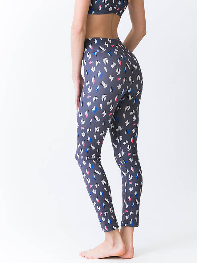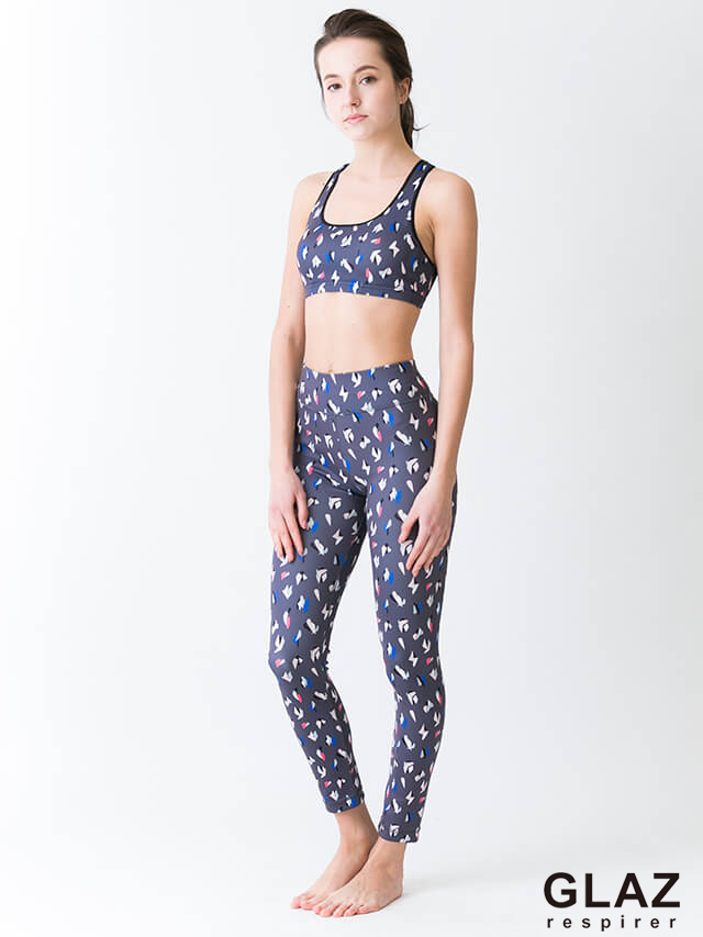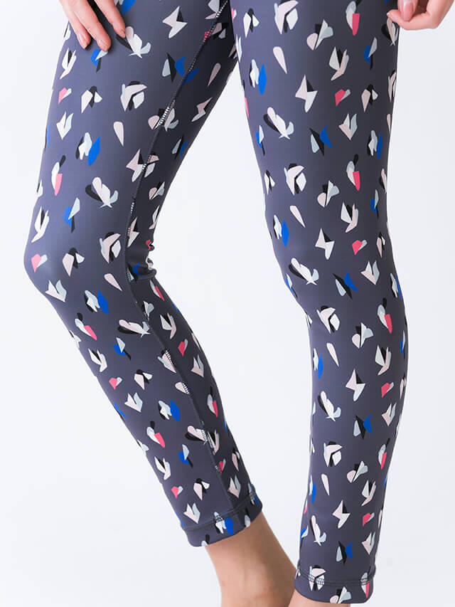 可憐な小花をイメージしたオリジナルの幾何学模様。色使いも可愛らしく、フェミニンに着こなせます。優れた伸縮特性をもち、ヨガやワークアウトのあらゆる動きに対応するレギンス。中肉素材ですが軽く、シワになりにくい素材です。