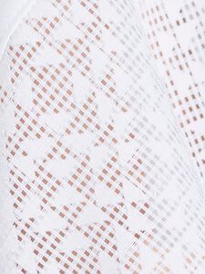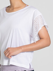 おしゃれさとヨガに必要な動きやすさを兼ね揃えた袖付きのトップスはかなり使える一枚!肩線を落としたドロップショルダーと広めの袖口で女性らしさを演出します。アクセントとなる幾何学模様のオパールレースはかわいくなりすぎず、爽やかな印象に。