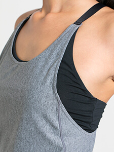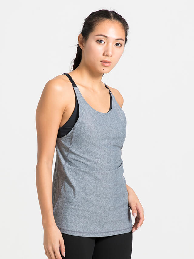 異素材のコンビネーションが楽しめるレイヤードタンク。運動量の多いヨガをサポートする高機能素材もポイントです。